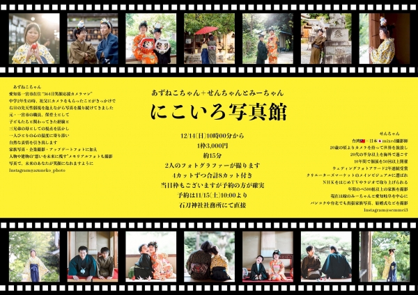 にこいろ写真館 2025-11-10 17:50:33 2人のプロによる にこいろ写真館12月14日のみオープン当日受付もありますが、11月15日午前10時より予約枠も用意しております!大切な人へお正月写真を送りませんか?参加料3000円です